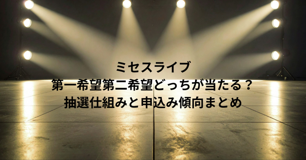 ミセスライブで当たりやすい席はある?2026年版の考え方 ミセスライブに「必ず当たりやすい席」は公式にはありません人気が集中しやすい席と分散しやすい席の“傾向”はあります2026年は倍率が高まりやすく、席種より申込み戦略が重要です ミセスライブでは... -