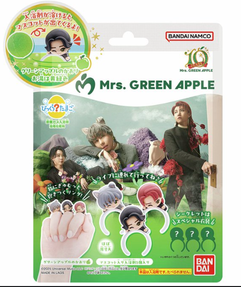 ミセスの人気コラボとして話題の「ミセス びっくらたまご」。今回11月に登場する「びっくらたまご Mrs.GREEN APPLE」は、ミセスのメンバーをモチーフにしたマスコットリングが付属する、グリーンアップルの香りの入浴剤。