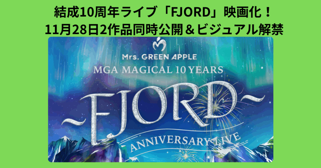 出典:oricon Mrs. GREEN APPLEの結成10周年を記念し、7月26・27日に横浜で開催された野外ライブ「FJORD」がIMAX上映で映画化‼ 本公演は2日間で約10万人を動員し、WOWOWでの生中継や15の配信サービス、全国325館でのライブビューイング、さらにカラオケビ... -