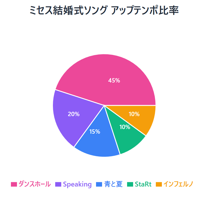 さらに、SNSでは「ダンスホール入場」の投稿が圧倒的に多く、式場プランナーが推奨する入場曲としても上位に入っています。「Speaking」や「StaRt」も軽快なテンポが特徴で、特に友人ゲストの多い披露宴で好まれやすい傾向があります。