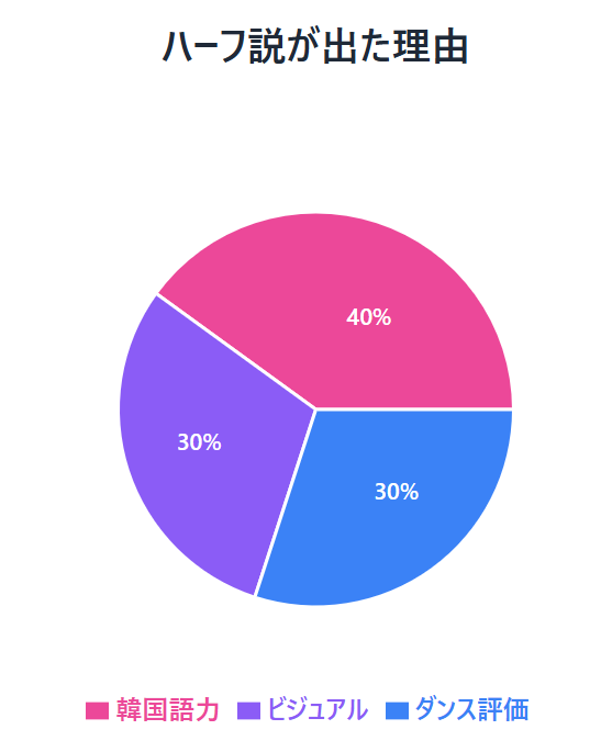 ハーフ説は、韓国語力の高さやK-POP風のビジュアル、ダンススキルが重なって生まれた噂です。見た目と能力の印象が強いため、誤解が広まりやすかったと考えられます。